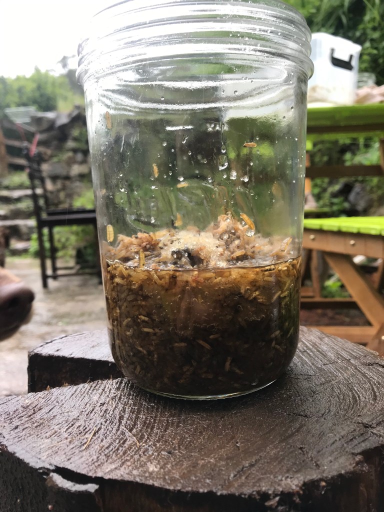 Après avoir enterré le riz, je l’ai laissé fermenter pendant une semaine. Le riz a développé une mousse blanche sur son dessus (les micro-organismes locaux).